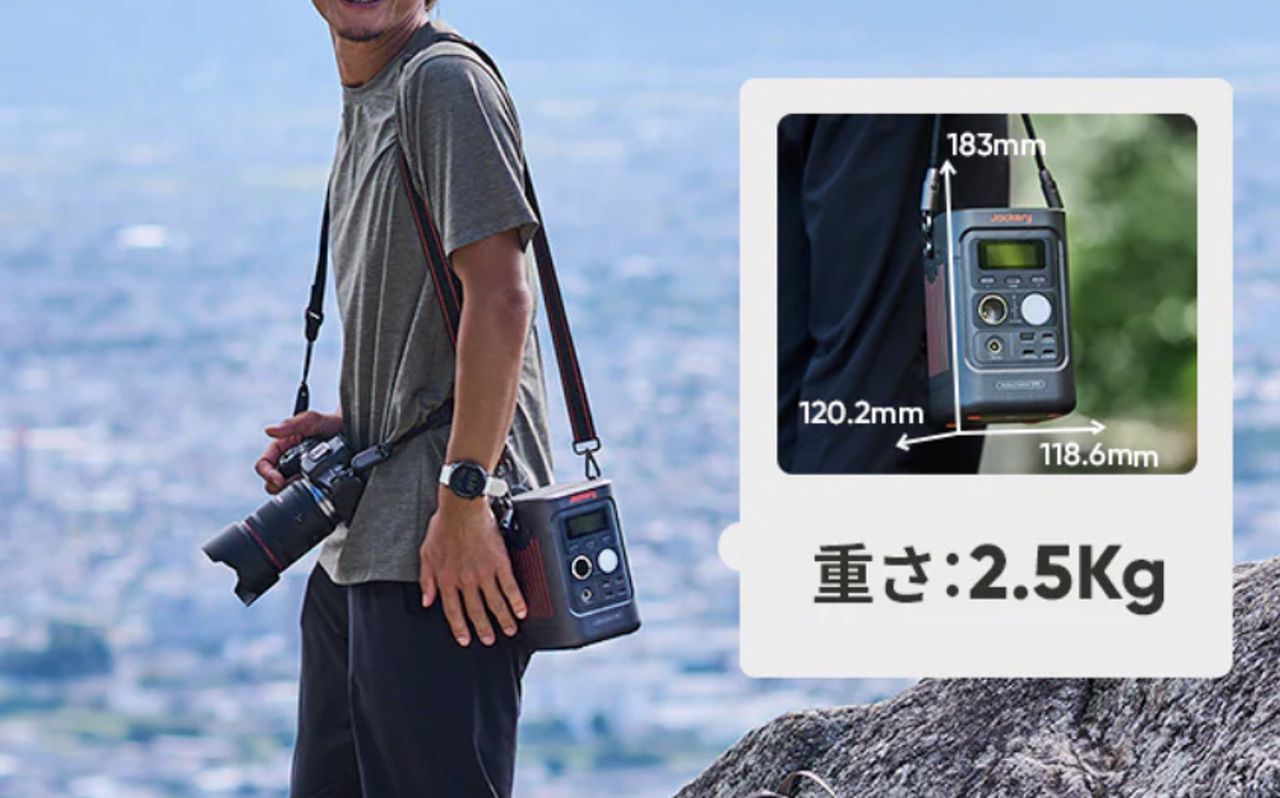 「肩掛けストラップによる両手フリーの利便性」と「省スペースな垂直(タワー)設計」という強みですが、Jackery 300Dも全く同じ利点を持っています。